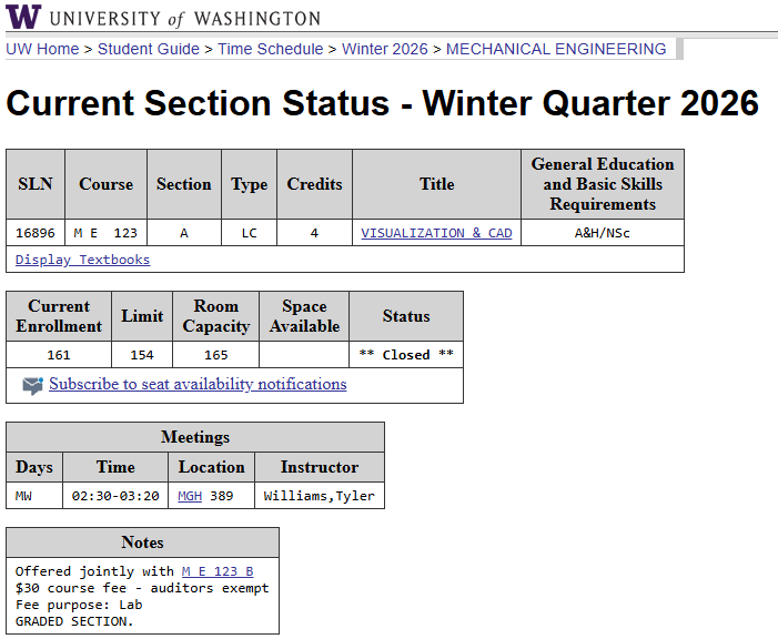 ME Advising does not maintain waitlists, so if a course is full, you should sign up for Notify.UW to be notified if a seat becomes available. In many cases, if the course is taught in a subsequent quarter, our advice would be to adjust your plan accordingly. For example, ME 323 often fills in Autumn so you are free to sign up for notifications in hopes that someone drops, but we recommend moving forward with an alternative plan that anticipated ME 323 be taken in the Winter quarter. On the ME Undergraduate Canvas page, students in the major can access the Quarters Courses Taught document that will be helpful in guiding through alternative plans.